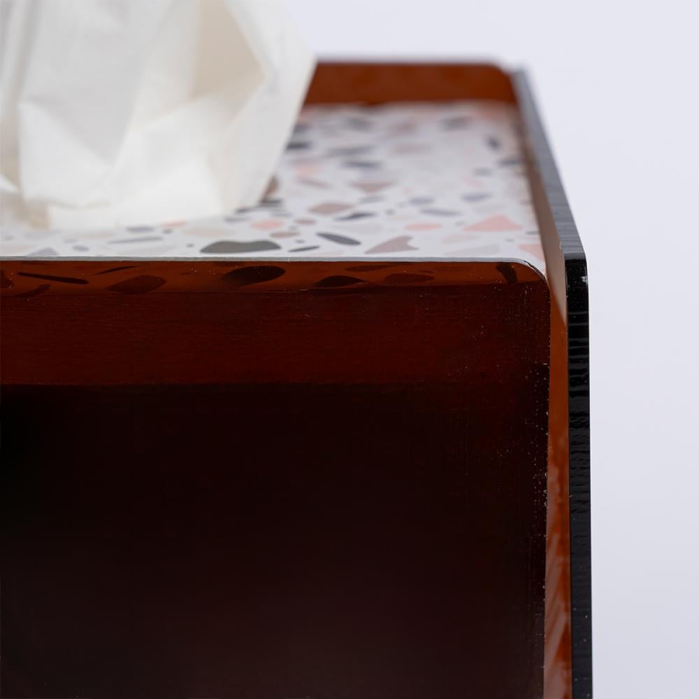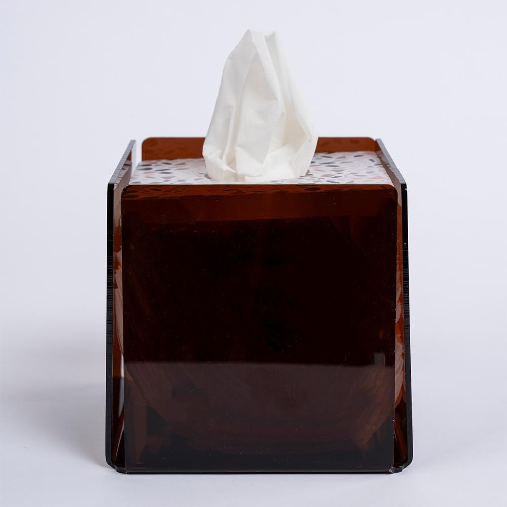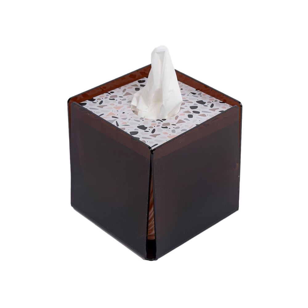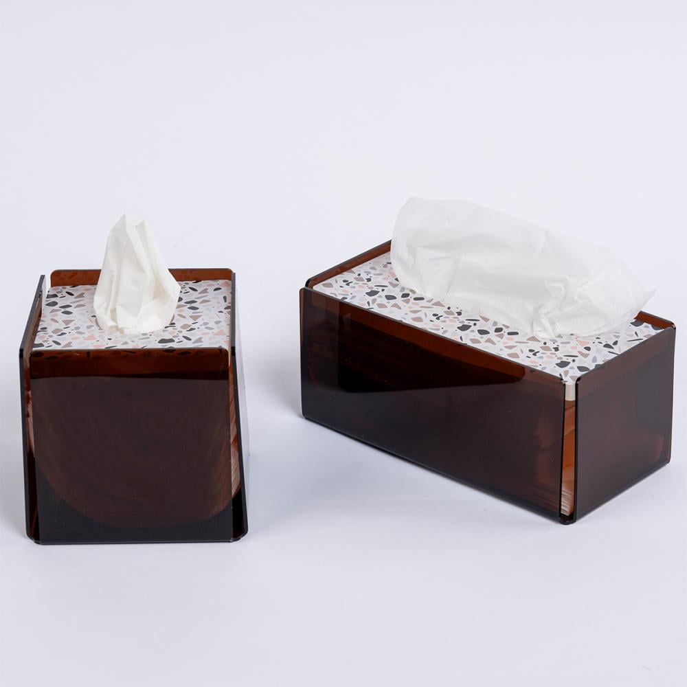 علبة مناديل من الاكريلك البني والرخام التيرازو بتصميم مميز ومختلف ، تضيف لمسة راقية إلى ديكور غرفة المعيشة أو المكتب، مثالية لمحبي التصميم العصري.