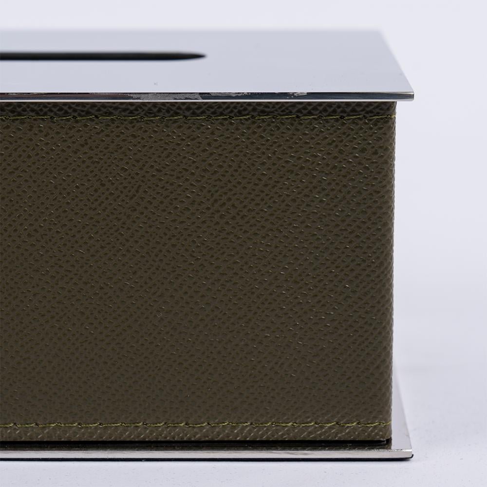 علبة مناديل مربعة جلد زيتي وستيل فضي